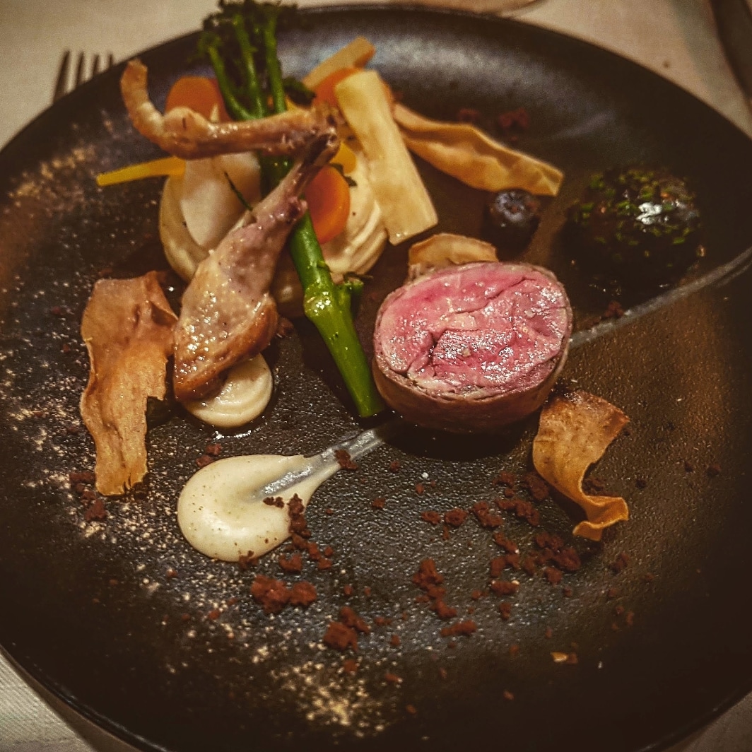 The highlight was a coin of pigeon dressed in bacon, drizzled with a blueberry sauce before your eyes. On the side was cacao crumble, 1km potatoes (as in they travelled less than one kilometre from terroir to table) and a ‘surprise macaron’.